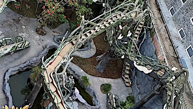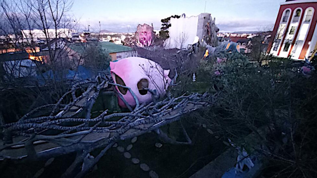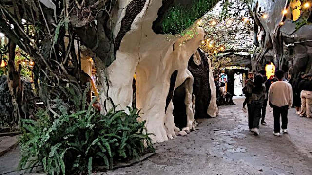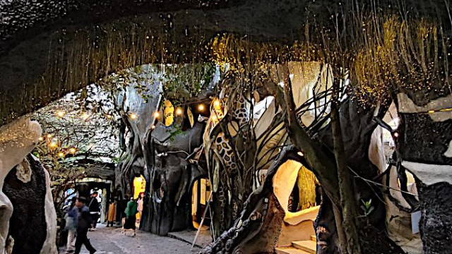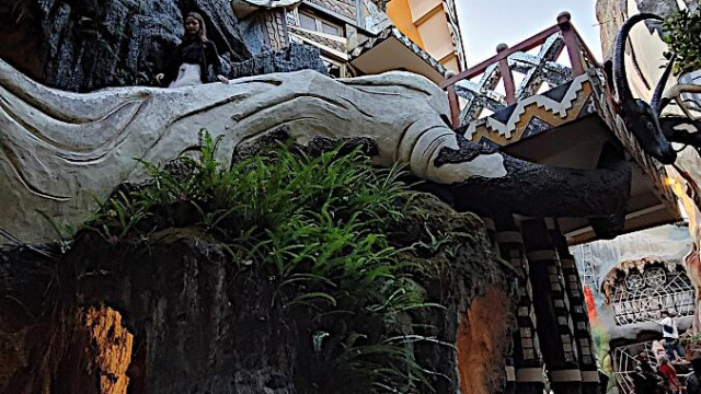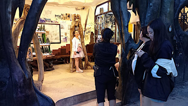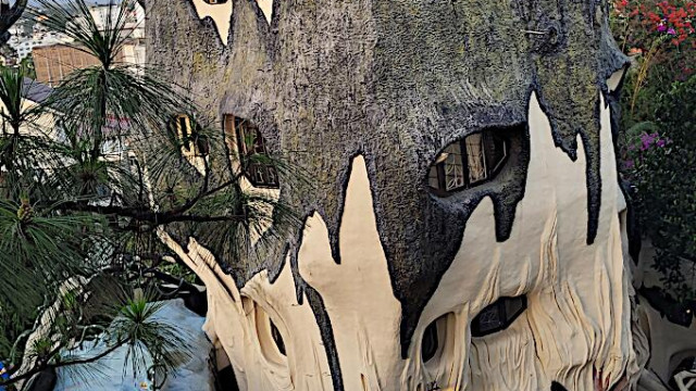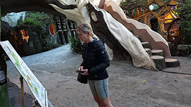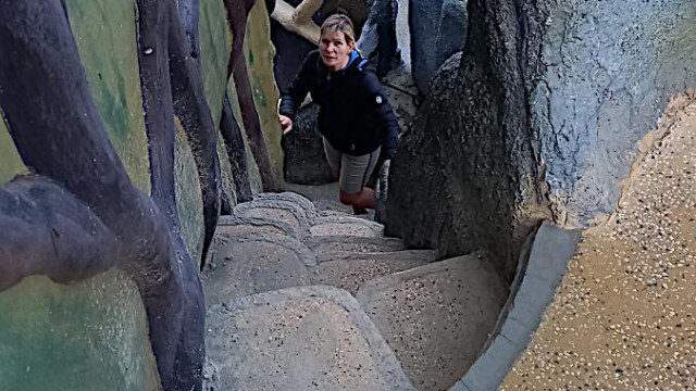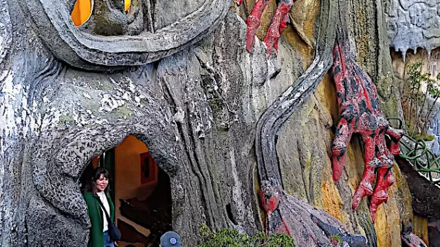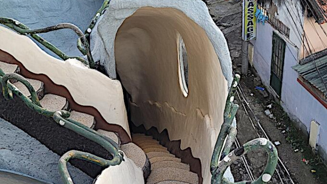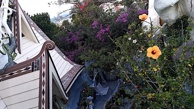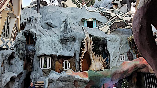 Das kann man nicht beschreiben, da sprechen die Bilder für sich. Einen Baustil kann man nicht erkennen, das Innere der Gebäude besteht aus Höhlen, verschlungenen Gängen, gewundenen Treppen, skurrilen Möbeln und Tierstatuen. Wir haben sehr viel Spaß beim Erkunden des Hauses.
