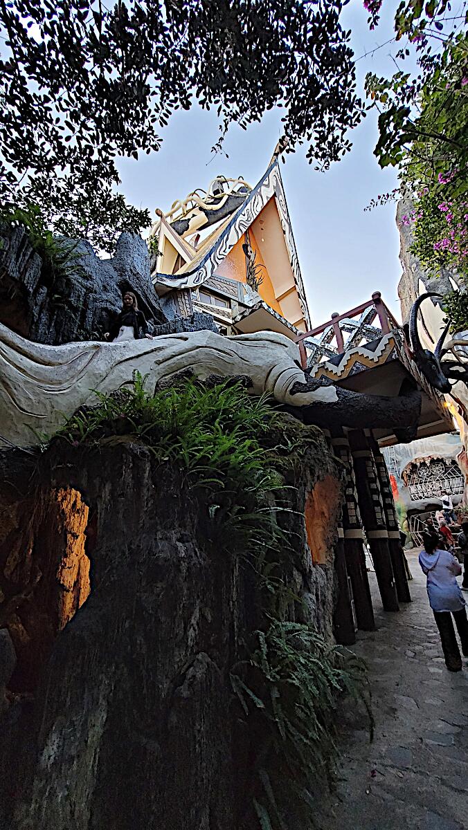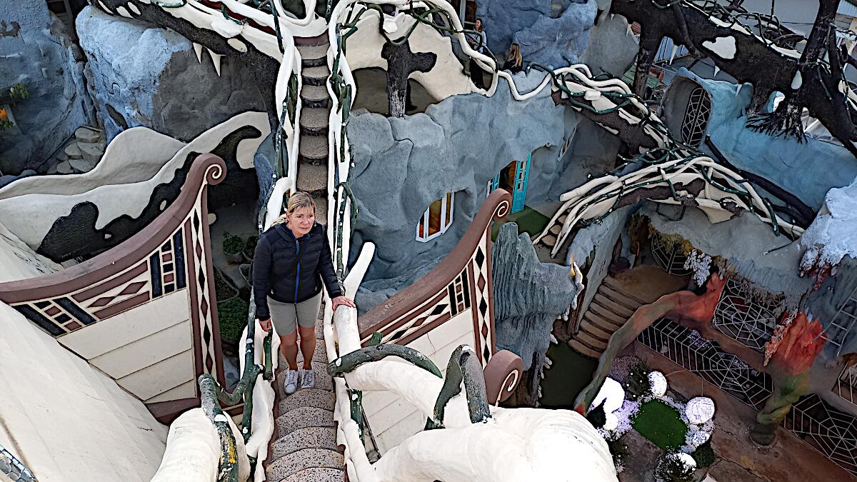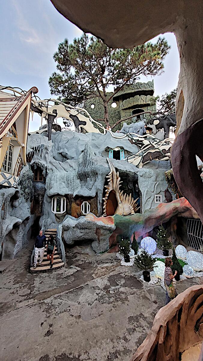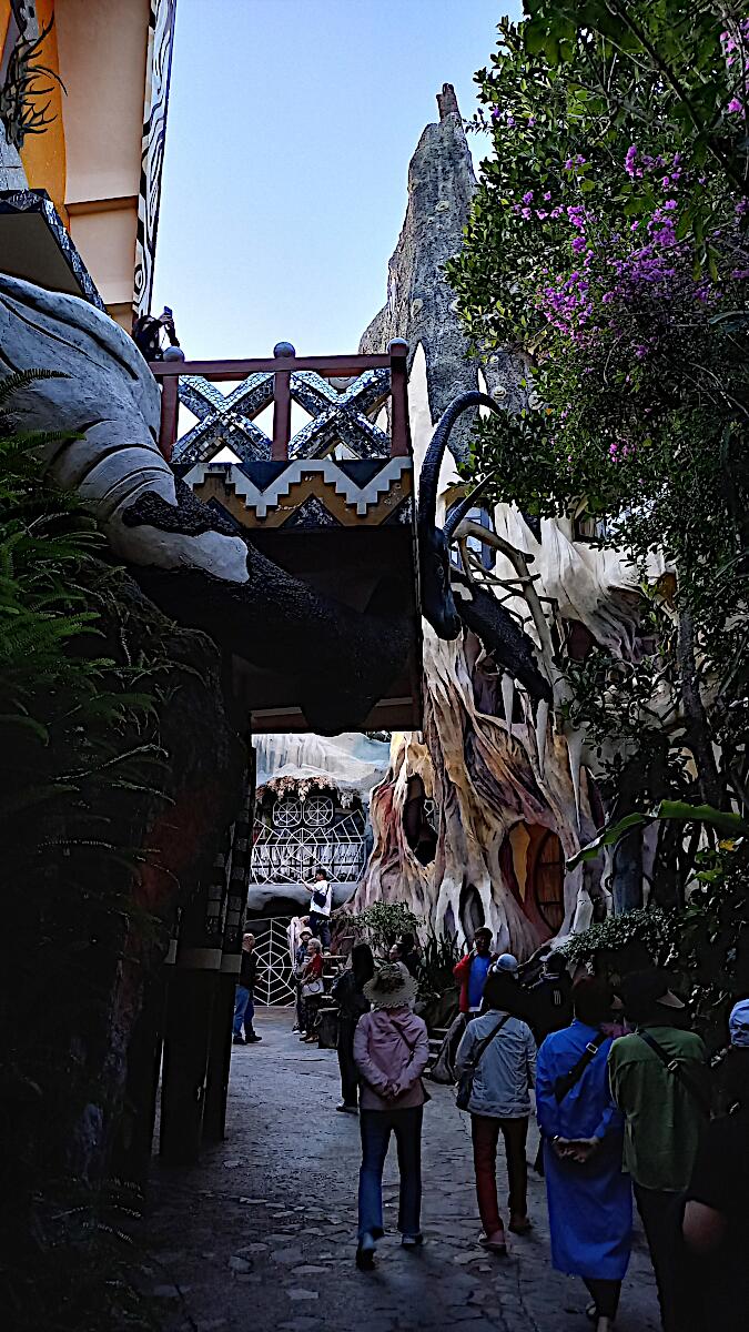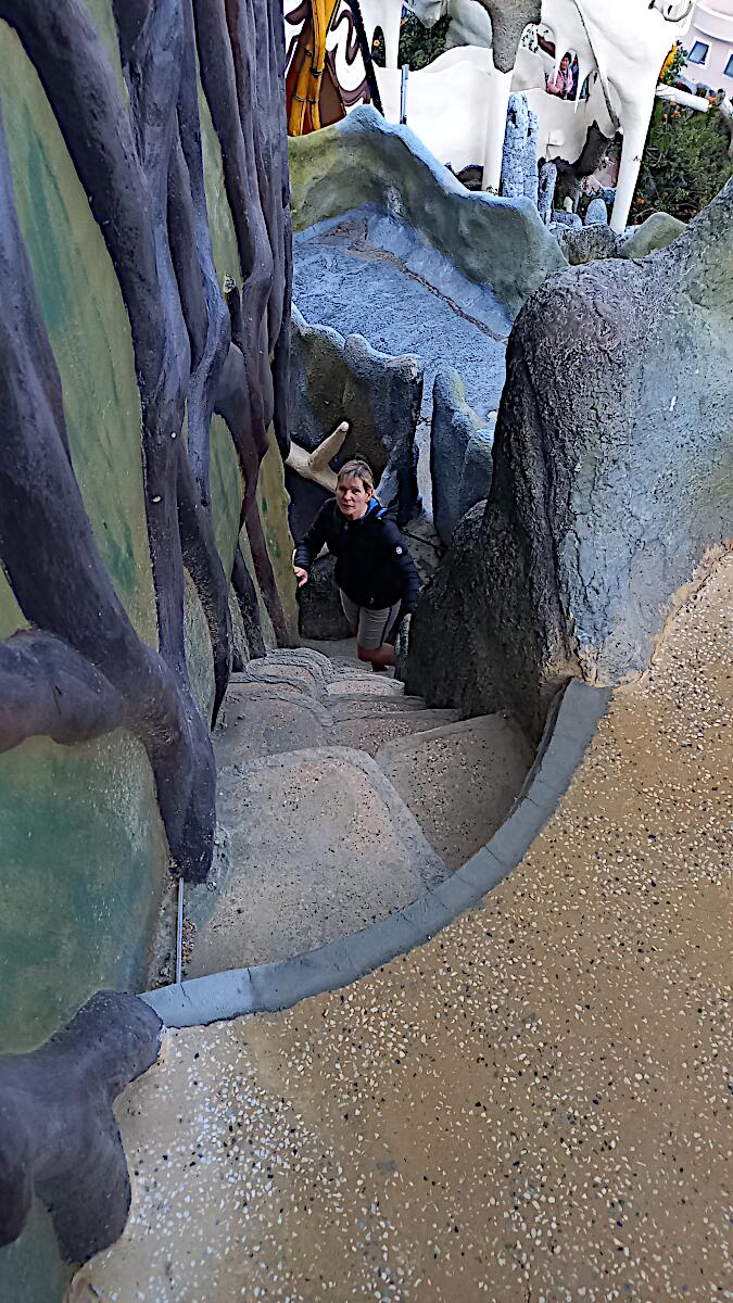 Das kann man nicht beschreiben, da sprechen die Bilder für sich. Einen Baustil kann man nicht erkennen, das Innere der Gebäude besteht aus Höhlen, verschlungenen Gängen, gewundenen Treppen, skurrilen Möbeln und Tierstatuen. Wir haben sehr viel Spaß beim Erkunden des Hauses.