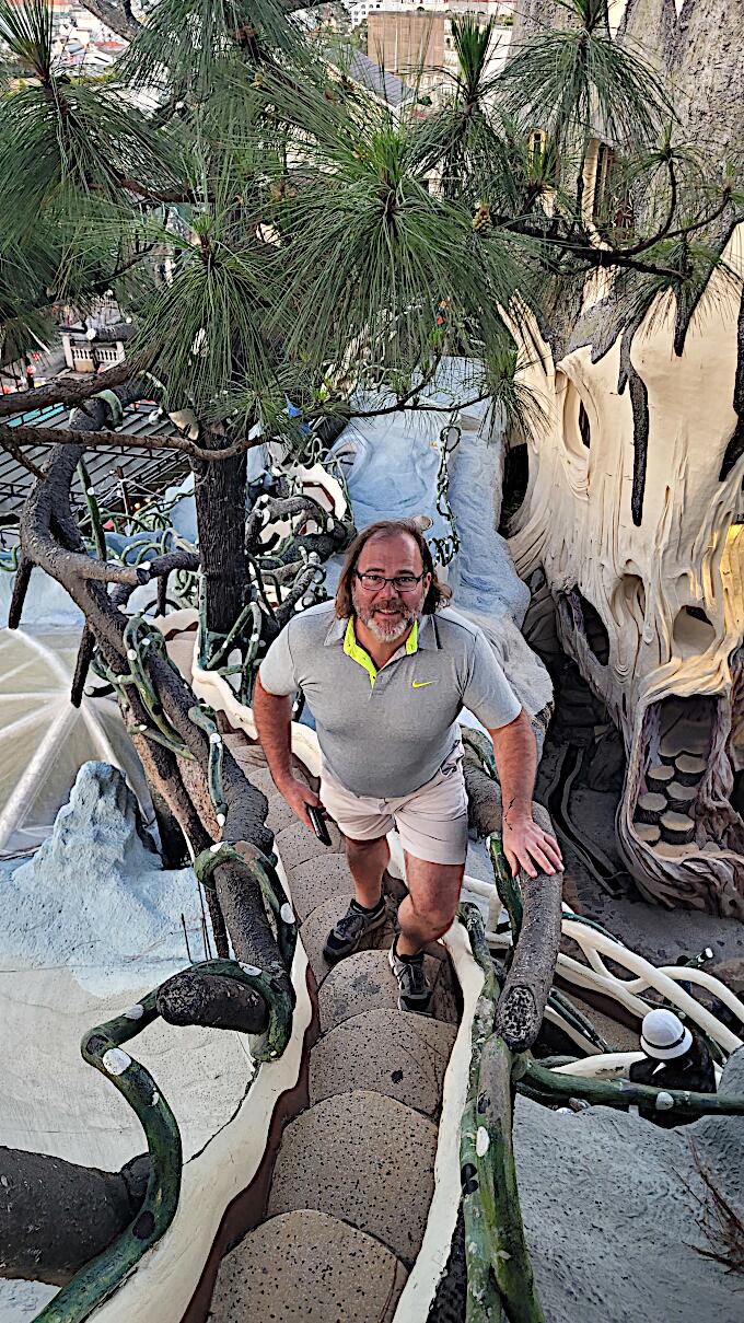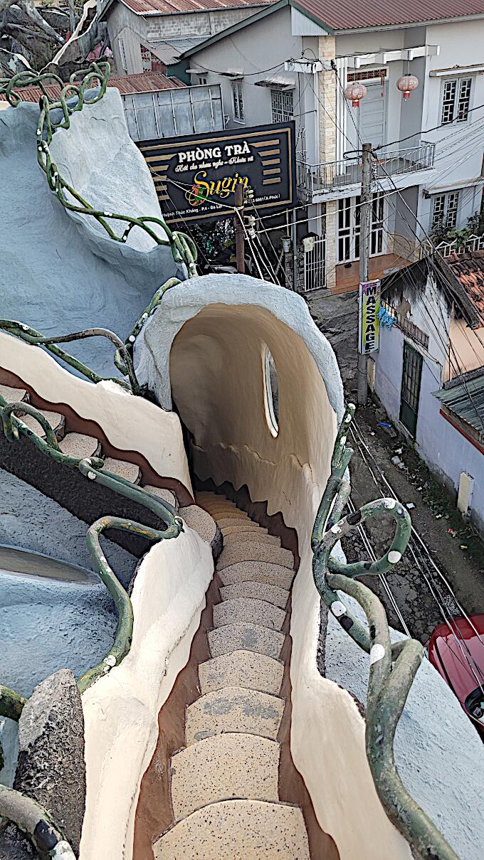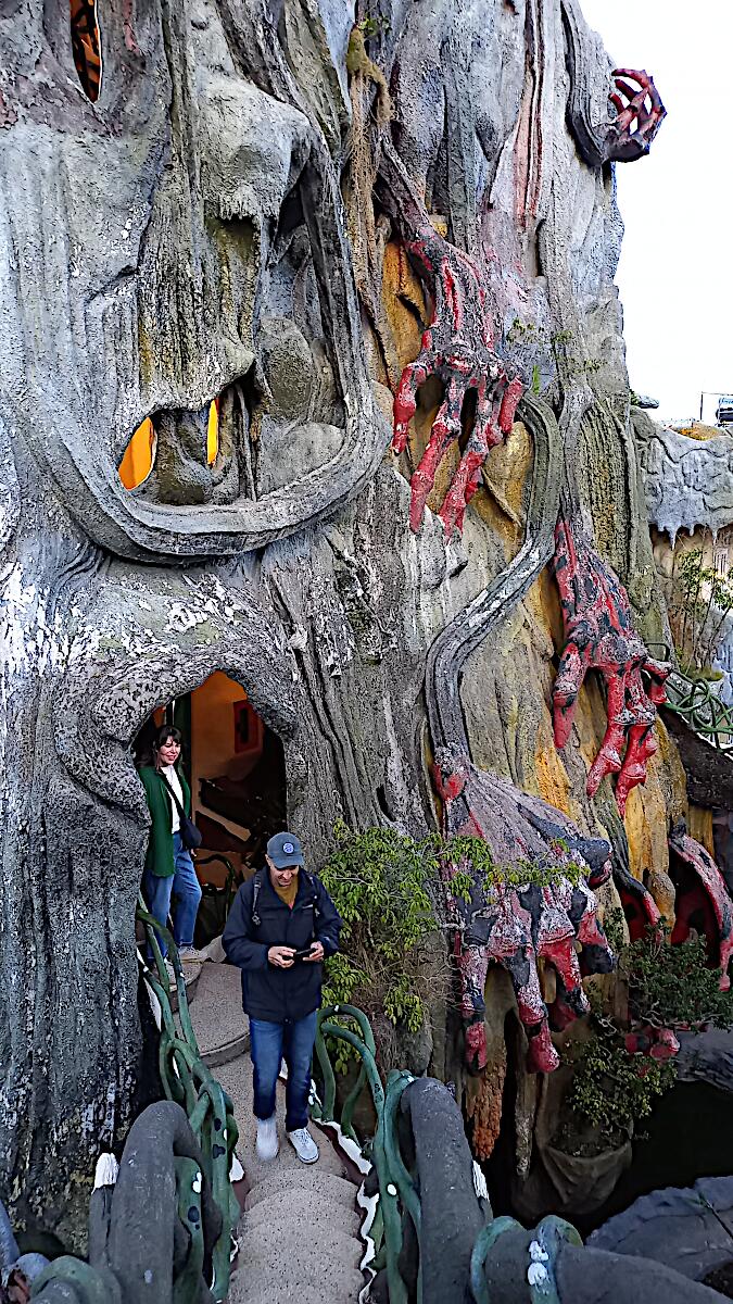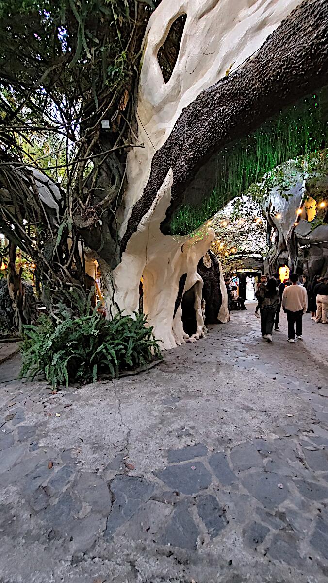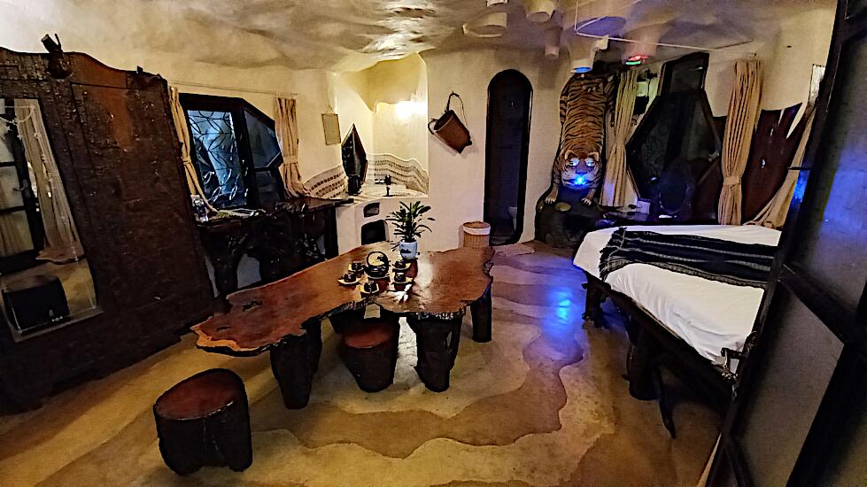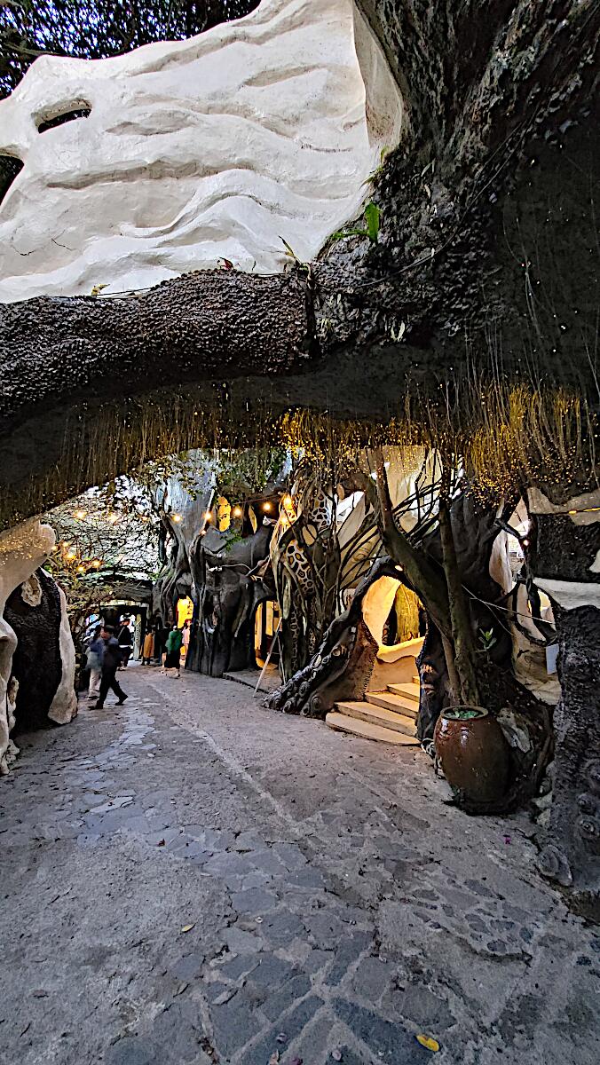 Das kann man nicht beschreiben, da sprechen die Bilder für sich. Einen Baustil kann man nicht erkennen, das Innere der Gebäude besteht aus Höhlen, verschlungenen Gängen, gewundenen Treppen, skurrilen Möbeln und Tierstatuen. Wir haben sehr viel Spaß beim Erkunden des Hauses.