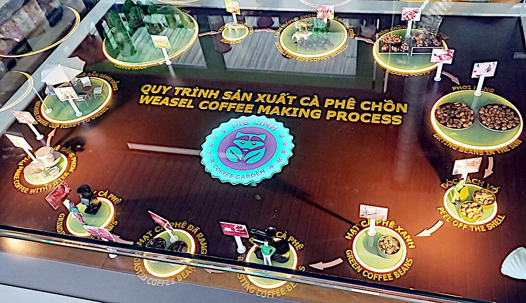 Ein Highlight ist die Kaffeeplantage Me Linh Coffee Garden. Man kann nicht nur verschiedene Kaffeesorten probieren, sondern auch die Kaffeepflanzen näher anschauen. Das Beste ist jedoch das Wieselgehege. Die Wiesel dienen zur Herstellung des Wieselkaffee. Die Tiere fressen sehr gerne Kaffeebeeren und die ausgeschiedenen, unverdauten Bohnen werden dann in einem speziellen Verfahren gereinigt, verarbeitet und geröstet. Die Wiesel werden dort jedenfalls verwöhnt und scheinen sich sehr wohl zu fühlen.