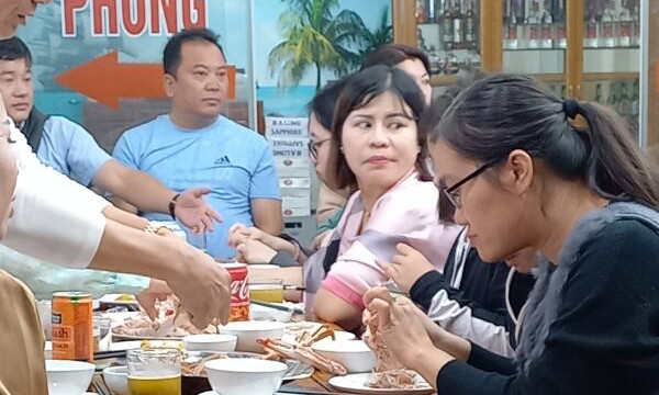 Mit einem Minibus werden wir zum Ha Long International Cruise Port gefahren und checken dort auf unserm Boot ein. Schon geht es mit einem Mittagessen im Family Dinner Style los, 6 Personen teilen sich ein Gedeck verschiedener Speisen. Auch einige Vegetarier sind dabei und sollen einen eigenen Tisch bilden. Die meisten an unsereem Tisch. Habe keine Lust uns aufzuteilen und beschließe für diese Mahlzeit eben auch Vegetarier zu sein.