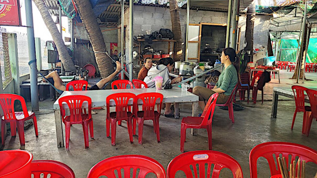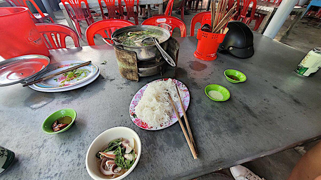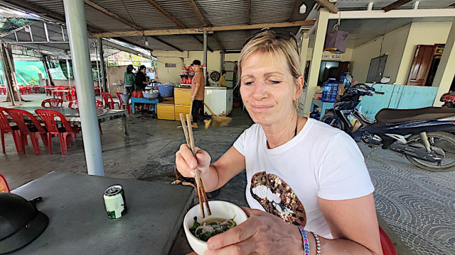 Zu einem der schönsten Strände in Vietnam, den Doc Let-Strand, (laut Internet-Recherche) fahren wir ca. 60 km auf unserem Roller. Erstmal haben wir diesen Strand verpasst und landen in einem kleinen Fischerdörfchen. Da wir sehr hungrig sind, bestellen wir uns einen Seafood-Hotpot. Zum Glück erklärt uns eine der Frauen, die in dem Restaurant arbeitet, „erklärt“, wie man einen solchen Hotpot isst (Sie konnte kein Englisch): Zuerst die Stengel von den Kräutern, Salat und Grünzeug entfernen. Dann das Seafood in den Topf mit kochender Brühe hinein geben, der auf einem Gestell vor uns steht. Anschließend schließlich Seafood, Grünzeug und Brühe sowie die weißen Nudeln, die ebenfalls vor uns stehen, in eine kleine Schüssel schöpfen und essen- sehr lecker! Dazu gibt es noch verschiedene Saucen in kleinen Schälchen, mit denen man das schon würzige Gericht noch intensiver würzen kann.