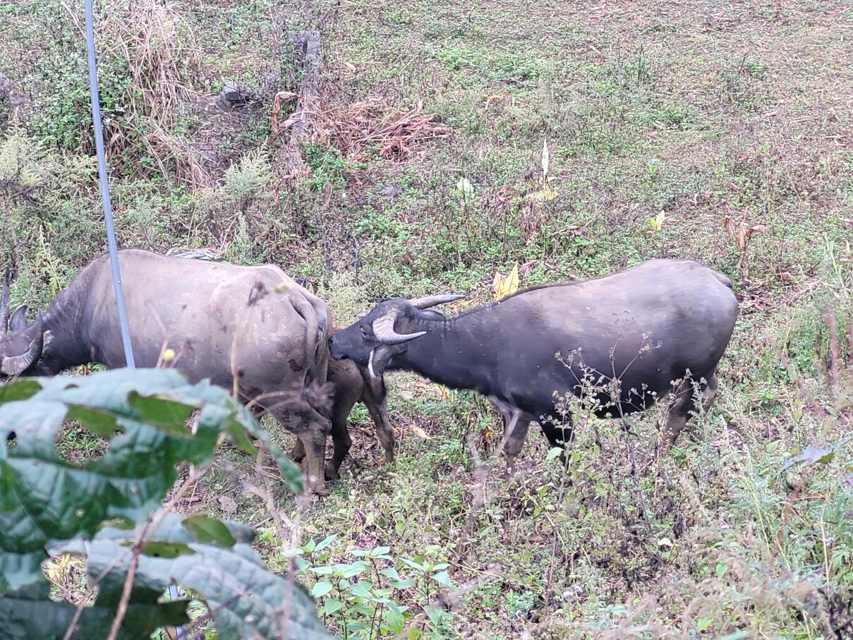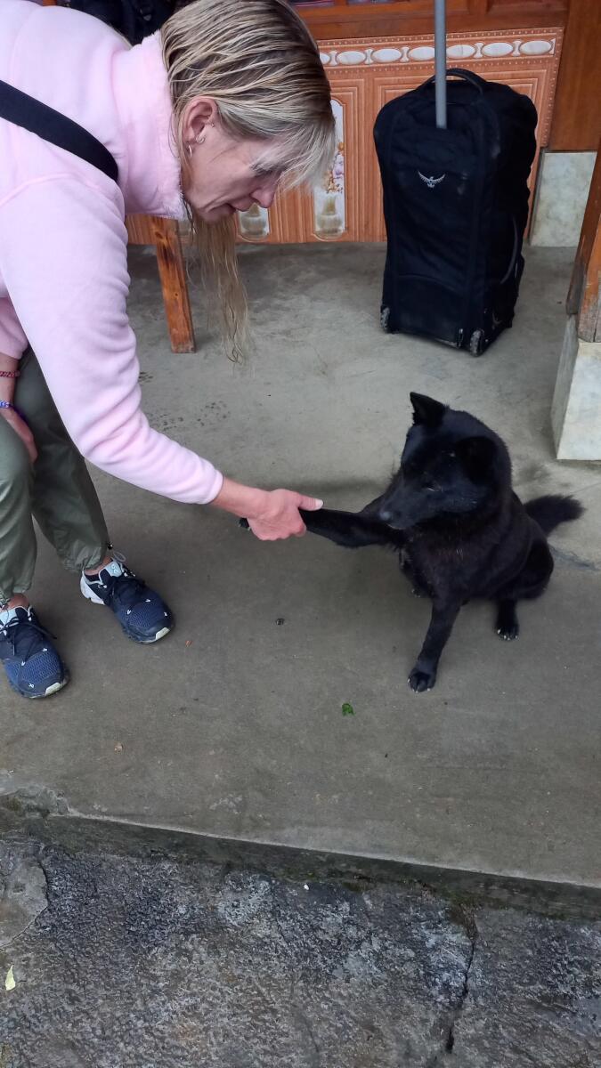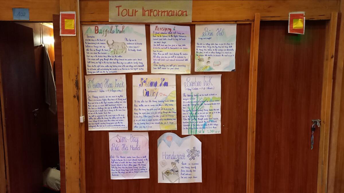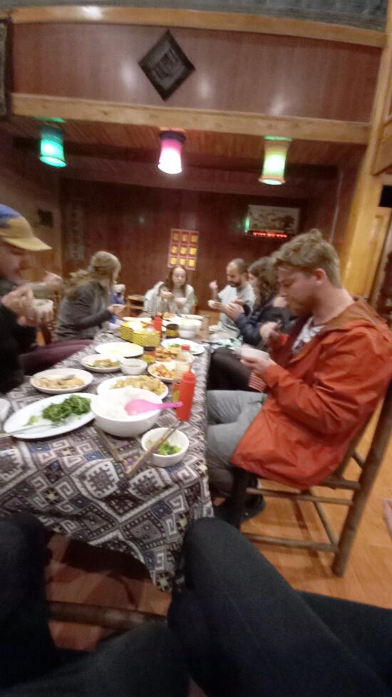 Für Abends haben wir uns im Homestay zum Family-Dinner angemeldet. Für jeweils 6 Gäste gibt es zum Teilen für die Gegend typisches Essen: Tofu mit frischen Tomaten, gemischtes Gemüse, vegetarische Frühlingsrollen, Hühnchen, Gurke und gebackene Banane. Sehr lecker und unterhaltsam. Nach langem abwägen buchen wir eine geführte Wanderung für den nächsten Tag mit „nur“ 4-5 Stunden, da wir den Tag auch noch einmal mit einem Kräuterbad und einer Massage abschließen wollen.