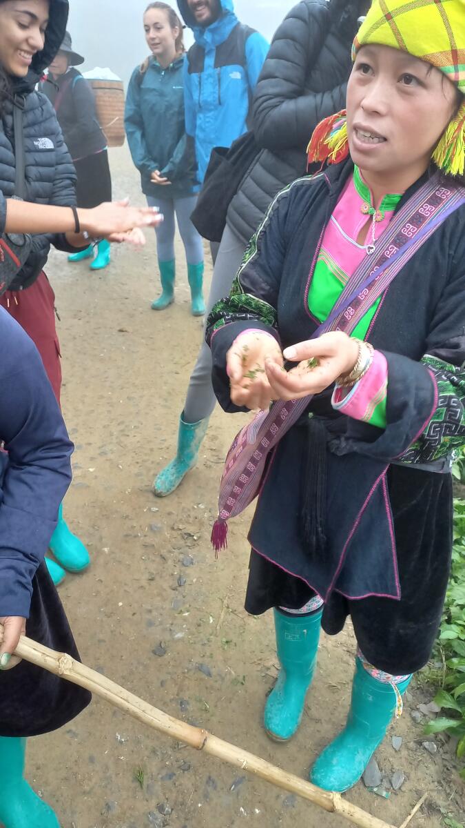 Nach dem Frühstück – Eiersandwich – starten wir früher als geplant mit 5 weiteren Gästen unseres Homestay’s. Außer unsere Führerin begleiten uns noch einige weitere Frauen aus der Gegend. Unterwegs unterhalten wir uns vor allem mit Ladu. Sie ist 29 Jahre alt, sieht jedoch aus wie 18. Sie hat 4 Kinder und stellt den traditionellen Stoff her, aus dem die Kleidung der einheimischen Bergbevölkerung hergestellt wird, die auch heute noch die meisten Leute dort tragen. Sie erzählt uns von sich und dem Leben der Einheimischen und das ihr Volk von den Mongolen abstammt. EthnoMed bestätigt die Aussage und untermauert diese plausibel. Interessant ist die bewegte Geschichte der Hmong und ihre Bedeutung im Vietnamkrieg.