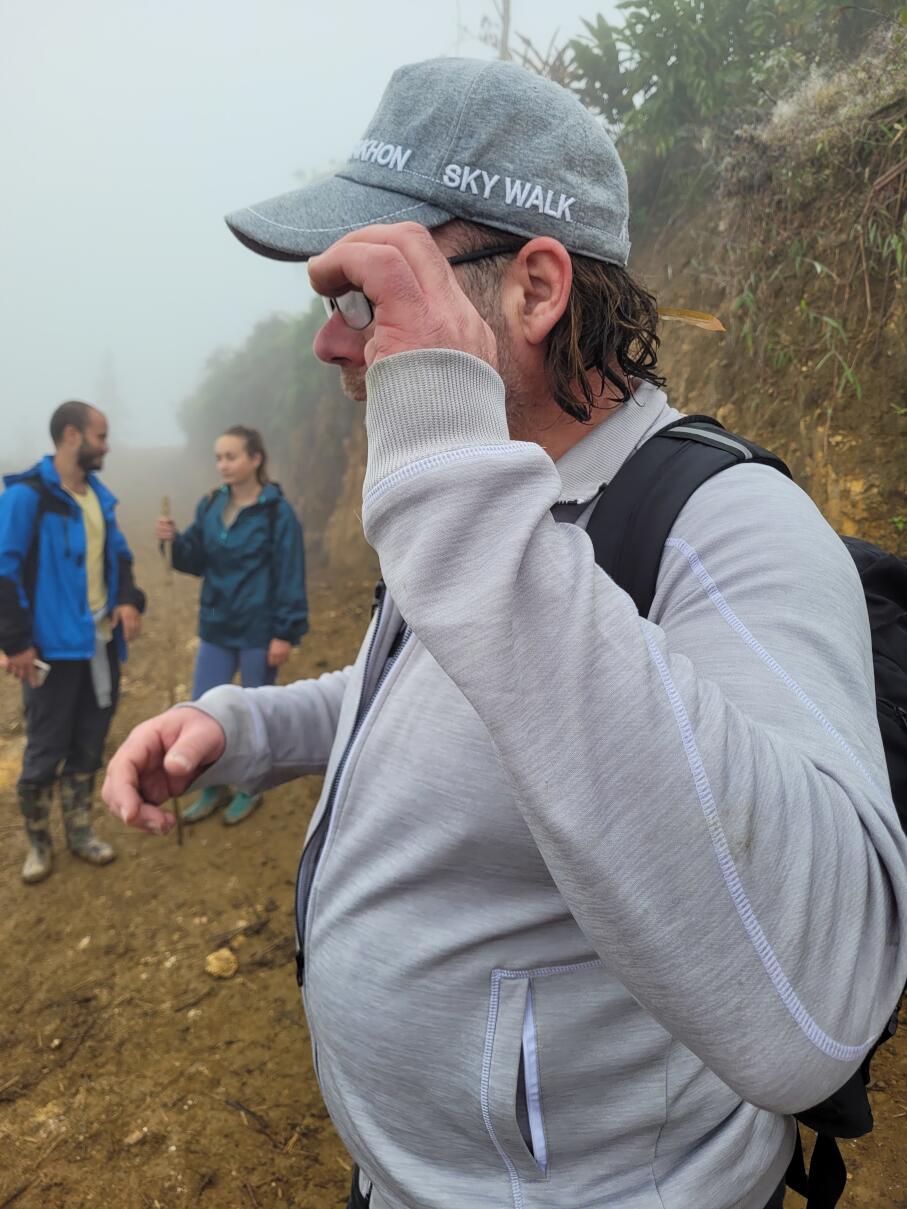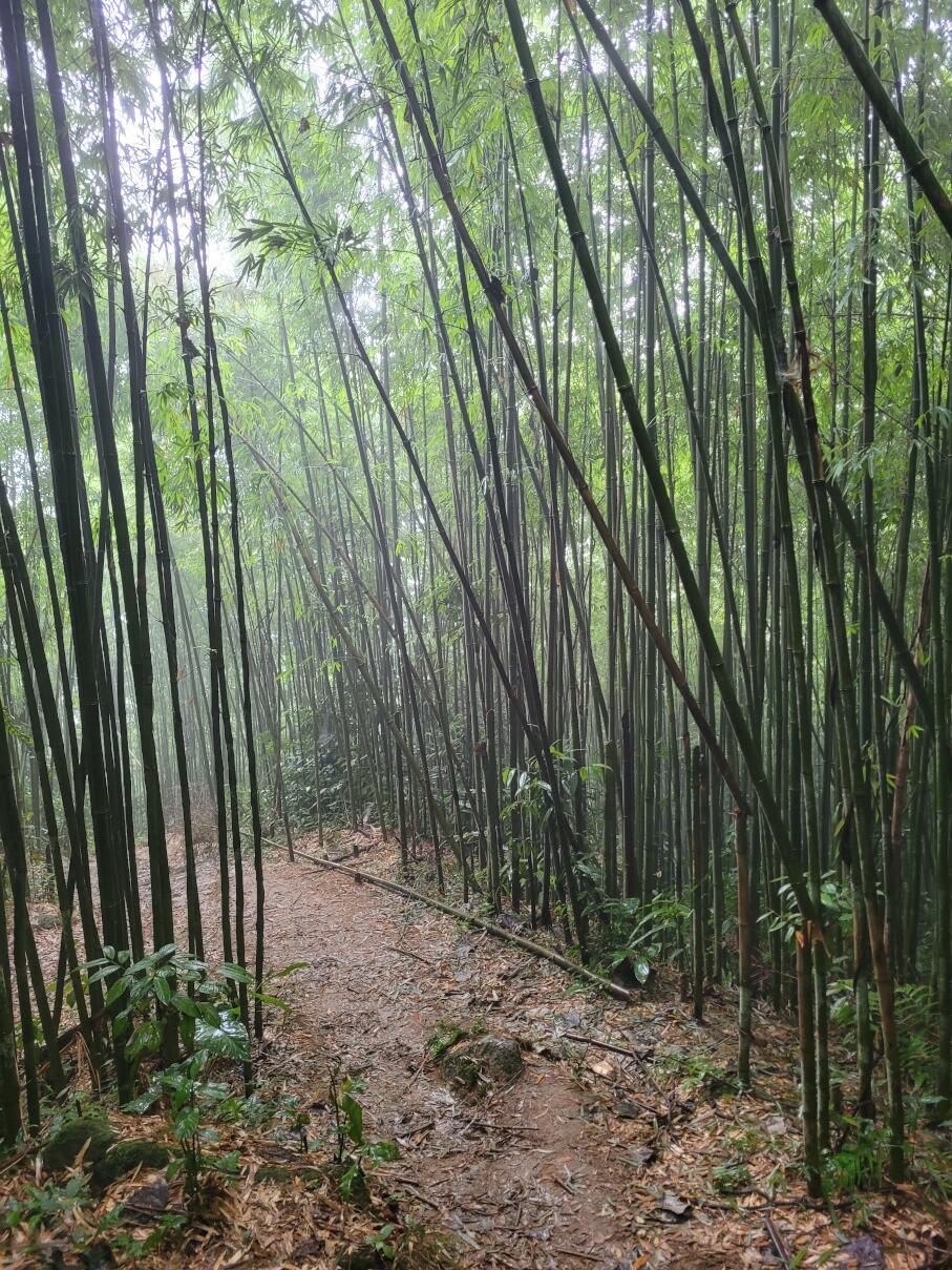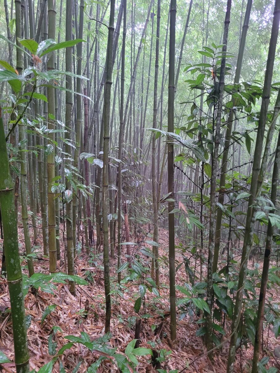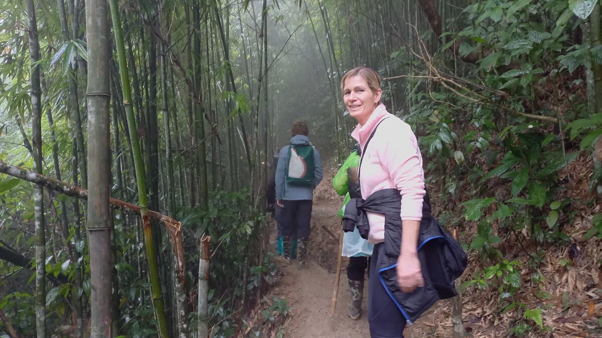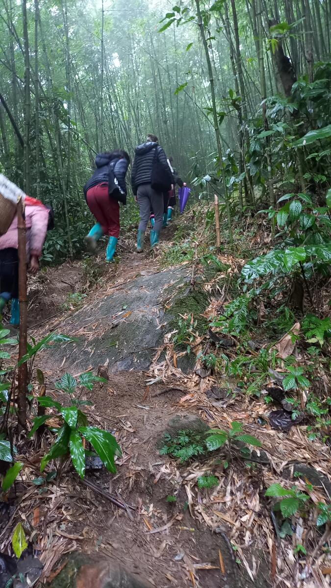 Englisch hat sie durch Touristen gelernt und spricht wirklich sehr gut. Unser Weg führt uns durch den Bambuswald. Durch den Regen der letzten Tage und die tief hängende Wolkendecke ist der Boden matschig und rutschig und wir sind froh, uns für die Leihgummistiefel entschieden zu haben. Unsere Begleiterinnen helfen bei ganz schwierigen Passagen mit, damit wir nicht doch noch ausrutschen und hinfallen.