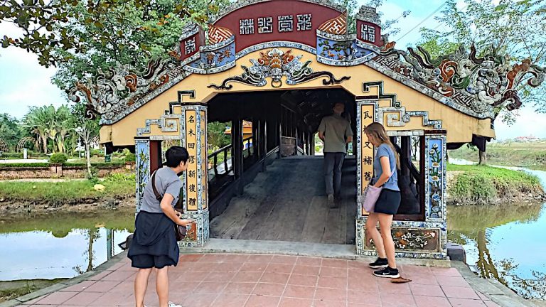 Wir verlassen Hue in Richtung Osten und halten nach kurzer Zeit im Vorort Lang Xa Bau. Hier besteht die Möglichkeit sich für die Fahr noch mit einigen Dingen auf dem lokalen Markt einzudecken. Hoan stellt uns hier eine im japanischen Baustil errichtete Brücke mit einer Fledermaus als Symbolfigur vor. Die Fledermaus gilt hier als Glücksbringer.