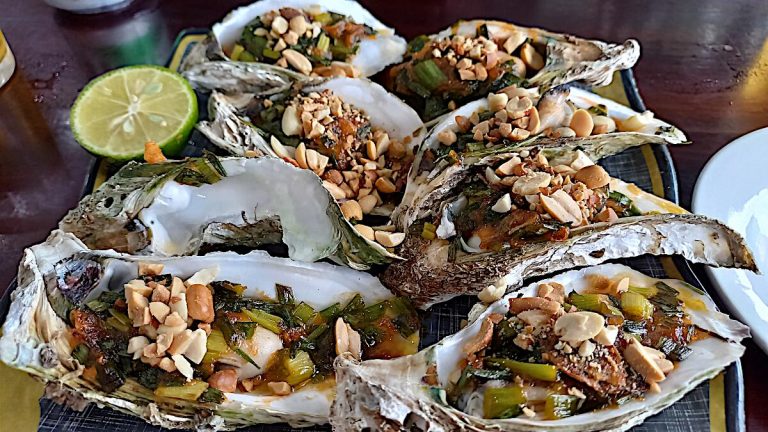 Der nächste Stopp ist in Lang Co am See Dam Lap An. Hier findet sich eine große Austernfarm und wir können die Züchter beim Ernten bestaunen. Es werden lange Stäbe mit alten Moped- oder Fahrradreifen bestückt im Wasser verankert. Innerhalb eines Jahres wachsen daran dann bis zu neun Kilo Austern heran. Bevor es weiter geht, dürfen wir uns die hiesige Spezialität natürlich nicht entgehen lassen und genießen ein Austern-BBQ für 150.000 VND, ca. 6 EUR. Ganz vorzüglich, ein Muss, wenn man hier ist.