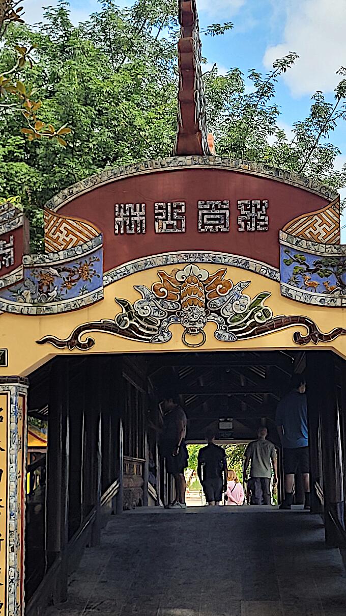 Wir verlassen Hue in Richtung Osten und halten nach kurzer Zeit im Vorort Lang Xa Bau. Hier besteht die Möglichkeit sich für die Fahr noch mit einigen Dingen auf dem lokalen Markt einzudecken. Hoan stellt uns hier eine im japanischen Baustil errichtete Brücke mit einer Fledermaus als Symbolfigur vor. Die Fledermaus gilt hier als Glücksbringer.