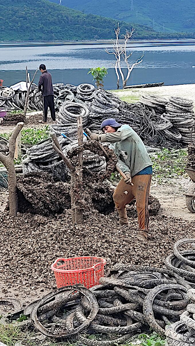 Der nächste Stopp ist in Lang Co am See Dam Lap An. Hier findet sich eine große Austernfarm und wir können die Züchter beim Ernten bestaunen. Es werden lange Stäbe mit alten Moped- oder Fahrradreifen bestückt im Wasser verankert. Innerhalb eines Jahres wachsen daran dann bis zu neun Kilo Austern heran. Bevor es weiter geht, dürfen wir uns die hiesige Spezialität natürlich nicht entgehen lassen und genießen ein Austern-BBQ für 150.000 VND, ca. 6 EUR. Ganz vorzüglich, ein Muss, wenn man hier ist.
